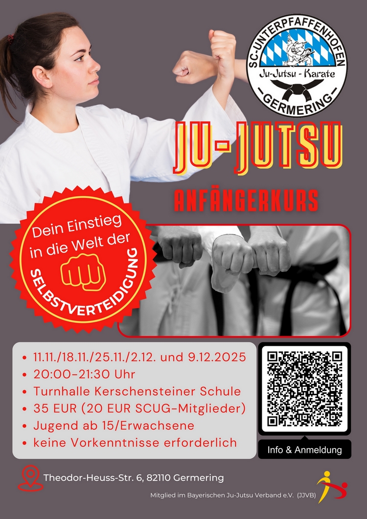 Nach den Herbstferien bieten die Germeringer Ju-Jutsuka einen Anfängerkurs Ju-Jutsu für Erwachsene an. An 5 Abenden führen die beiden Trainer Uwe Wolff und Eike Sommer (beide 2. Dan Ju-Jutsu) die Teilnehmenden in die spannende Welt der Selbstverteidigung ein.